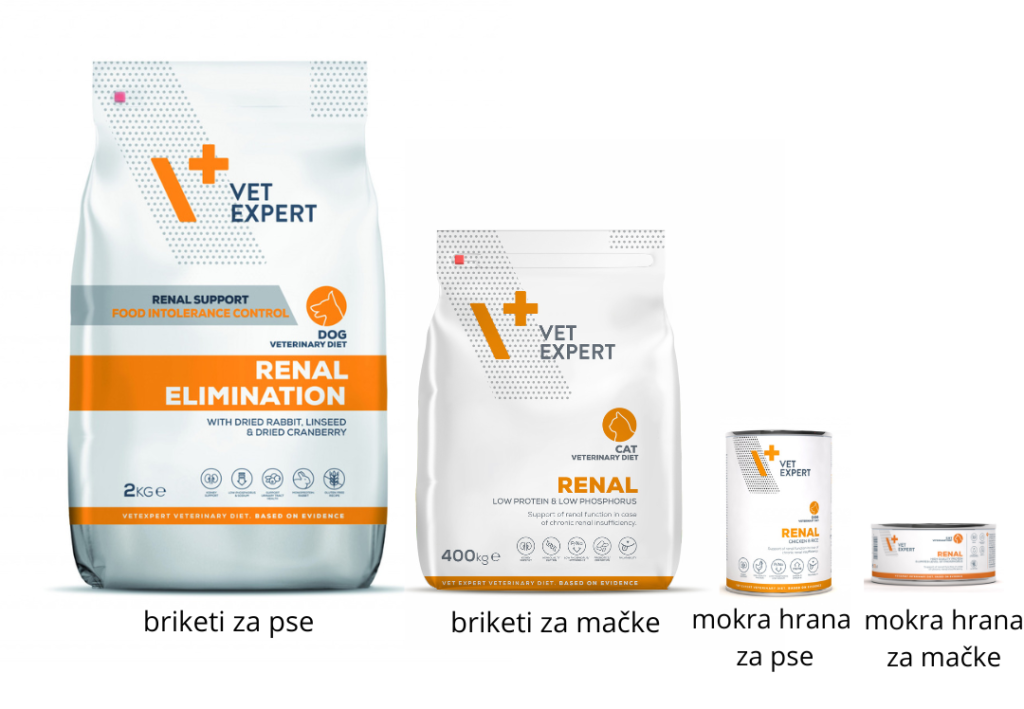 Poleg diete se svetuje tudi dodatek prehranskega dopolnila, ki nase veže odpadne produkte (uremične toksine in fosfor), ki se kopičijo v krvi. V končni fazi (stopnja IRIS 3 in 4) se priporoča uporaba kProtect-a, ki vsebuje kalcijev karbonat, ki nase veže fosfate in hkrati preprečuje hipokalcemijo. Poleg tega vsebuje še hitozamin, ki je učinkovit vezalec uremičnih toksinov in natrijev bikarbonat, ki uravnava metabolno acidozo. V začetni fazi (stopnja IRIS 2) pa je priporočljiva uporaba NormaPhos-a, ki nudi podporo delovanju ledvic. Vsebuje kalcijev karbonat in hitozamin, ki sta učinkovita vezalca uremičnih toksinov, poleg tega pa vsebuje tudi vitamin C in folno kislino, ki lahko preprečuje slabokrvnost.