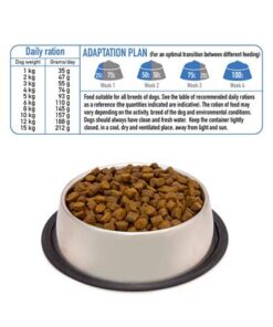 Hrana je primerna za vse pasme psov. Upoštevajte tabelo priporočenih dnevnih količin (navedene količine so okvirne). Količina hrane se lahko razlikuje glede na aktivnost, pasmo psa in okoljske pogoje. Psi morajo imeti vedno na voljo čisto, svežo vodo. Hranite posodo tesno zaprto, na hladnem, suhem in zračnem mestu, stran od svetlobe in sonca.