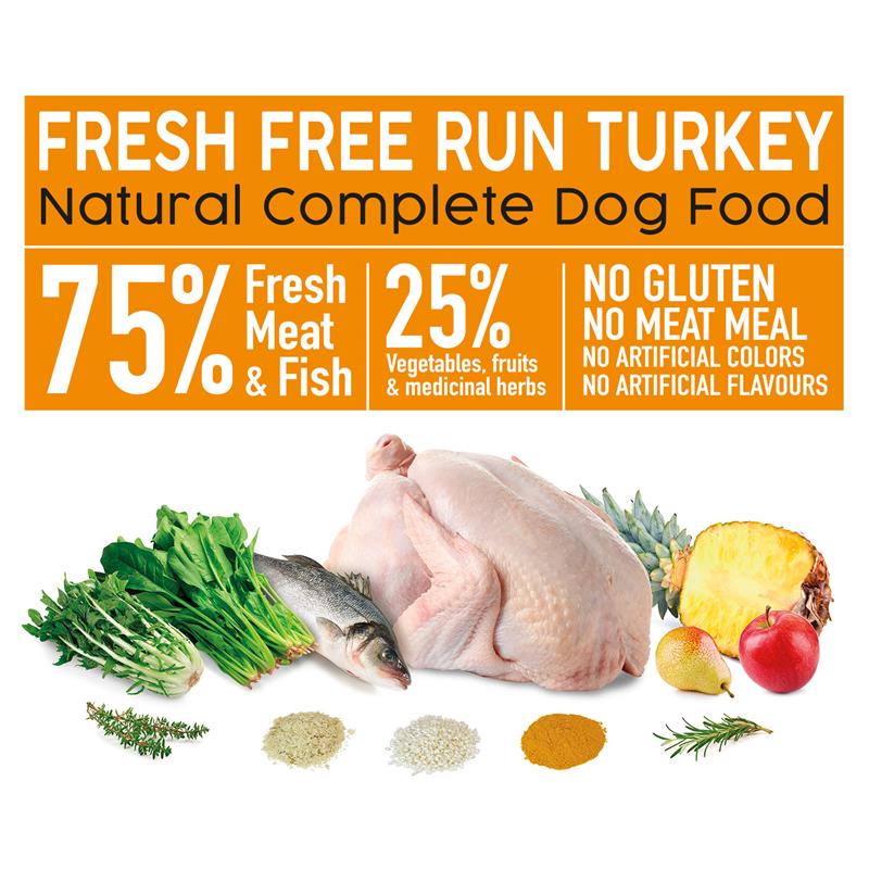 Popolna polsuha hrana za vse vrste odraslih psov, s 55% svežega purana, 20% sveže ribe in 25% zelenjave, sadja in zdravilnih zelišč.