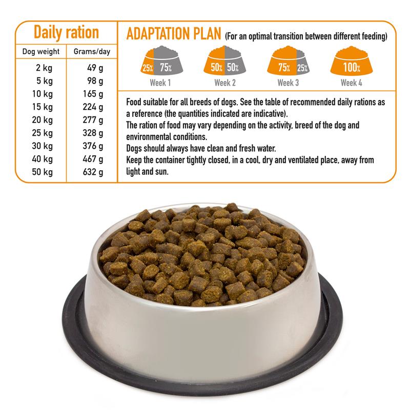 Hrana je primerna za vse pasme psov. Upoštevajte tabelo priporočenih dnevnih količin (navedene količine so okvirne). Količina hrane se lahko razlikuje glede na aktivnost, pasmo psa in okoljske pogoje. Psi morajo imeti vedno na voljo čisto, svežo vodo. Hranite posodo tesno zaprto, na hladnem, suhem in zračnem mestu, stran od svetlobe in sonca.