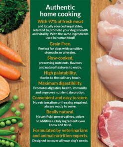 S 97 % svežega mesa in lokalno pridelane zelenjave, izbrane za spodbujanje zdravja in vitalnosti vašega psa.