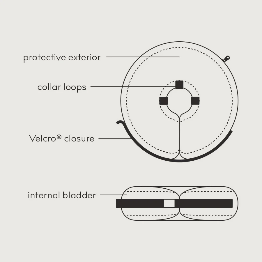 Napihnjen ovratnik nežno namestite okoli vratu svojega ljubljenčka, tako da je ventil obrnjen stran od njegovega smrčka. Z ježkom Velcro® na ovratniku KONG® ga tesno, a udobno zaprite.