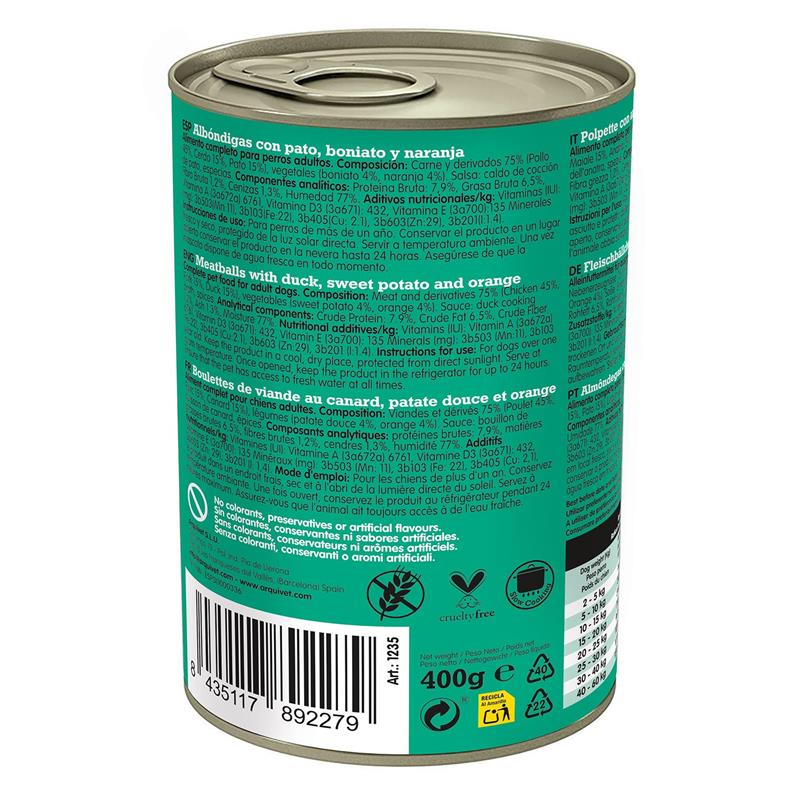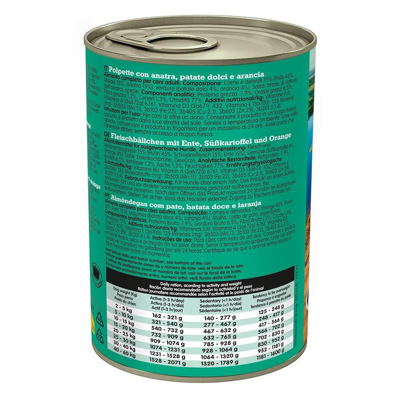 SESTAVA: Meso in stranski proizvodi 75% (piščanec 45%, svinjina 15%, raca 15%), zelenjava (sladki krompir 4%, pomaranča 4%). Omaka: račja juha, začimbe. Prehranski dodatki (na kg): Vitamini (IU): Vitamin A (3a672a) 6761, Vitamin D3 (3a671): 432, Vitamin E (3a700): 135 Minerali (mg): 3b503 (Mn:11), 3b103 (Fe:22), 3b405 (Cu:2,1), 3b603 (Zn:29), 3b201 (I:1,4). ANALITIČNE SESTAVINE: Surove beljakovine 7,9%, surova maščoba 6,5%, surove vlaknine 1,2%, surovi pepel 1,3%, vlaga 77%.