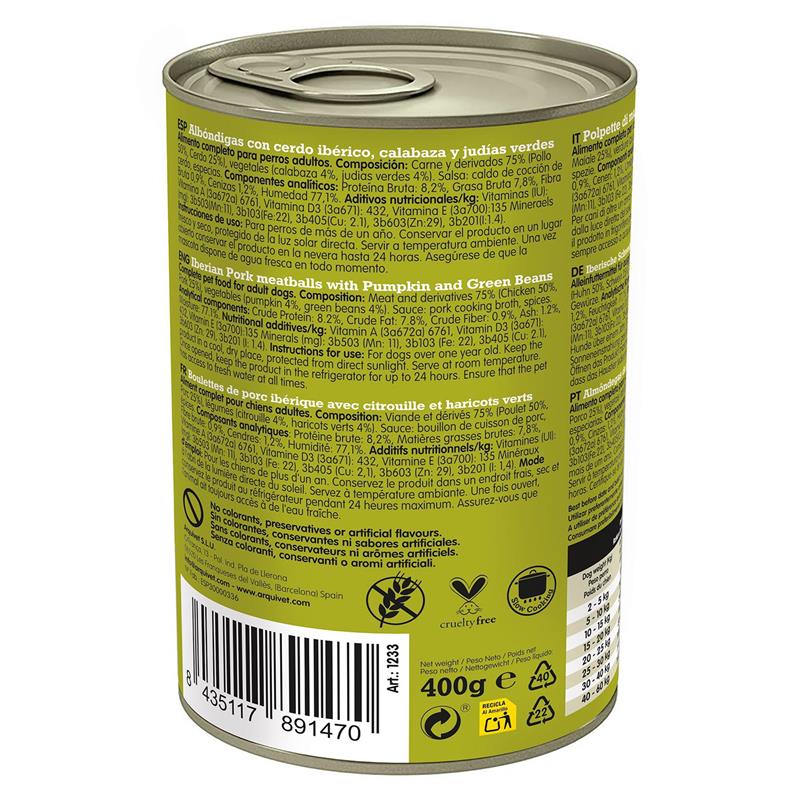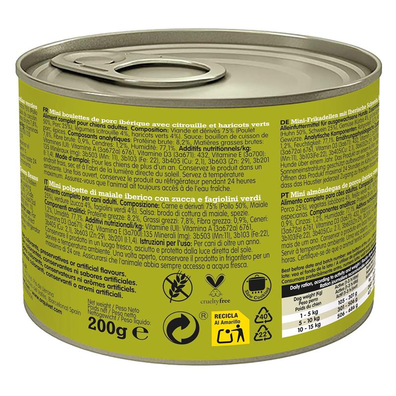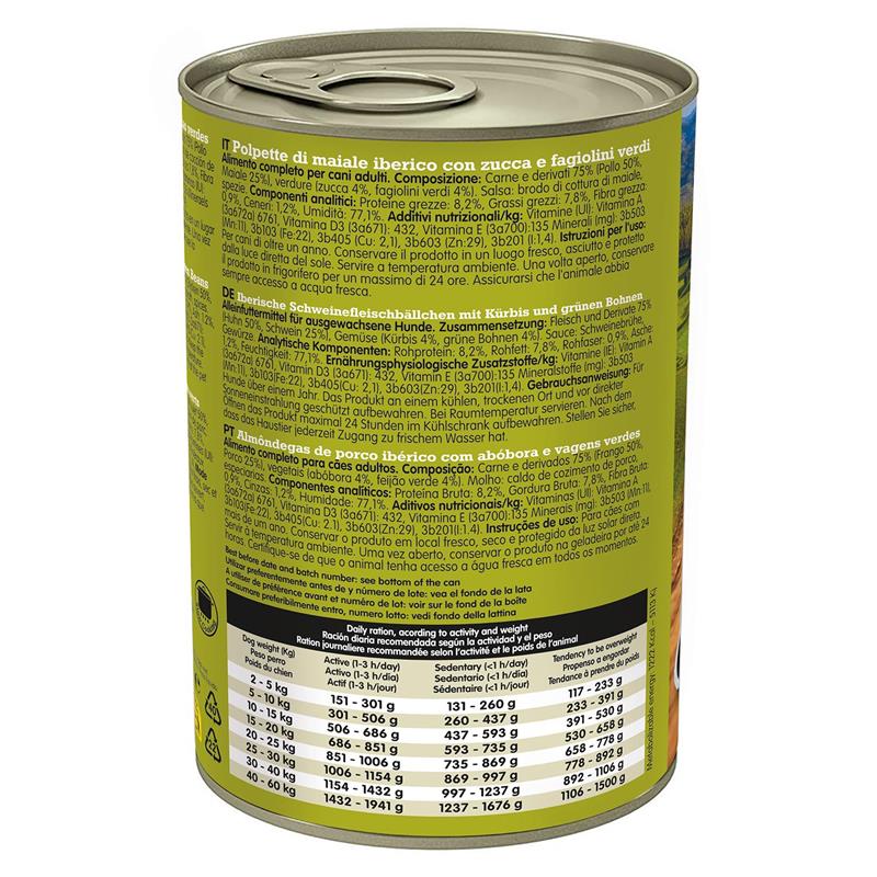 SESTAVA: Meso in derivati 75% (piščanec 50%, svinjina 25%), zelenjava (buča 4%, stročji fižol 4%). Omaka: svinjska juha, začimbe. Prehranski dodatki (na kg): Vitamin A (3a672a) 6761, vitamin D3 (3a671): 432, vitamin E (3a700):135 minerali (mg): 3b503 (Mn: 11), 3b103 (Fe: 22), 3b405 (Cu: 2,1), 3b603 (Zn: 29), 3b201 (I: 1,4). ANALITIČNE SESTAVINE: Surove beljakovine 8,2%, surova maščoba 7,8%, surove vlaknine 0,9%, surovi pepel 1,2%, vlaga 77,1%.