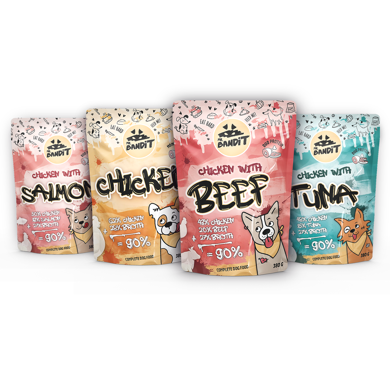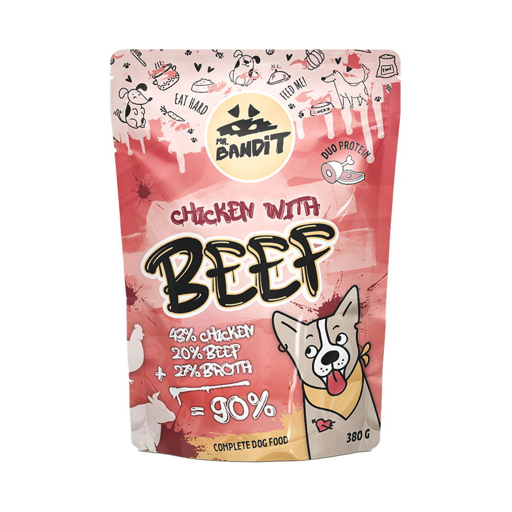 Sestava: piščanec 43 % (od tega piščančje meso 32 %, srce 4 %, piščančja maščoba 3 %, piščančja koža 4 %), juha iz govedine 27 %, govedina 20 %, krompirjev škrob 4 %, buča 2 %, korenje 2 %, riž 1,7 %, sušene brusnice 0,3 %. Analitska sestava: surove beljakovine 8,50 %, surove maščobe 3,0 %, surovi pepel 3,0 %, surove vlaknine 1,50 %, vlaga 82,0 %, kalcij 0,20 %, fosfor 0,15 %, FOS 3.00 g/kg. Prehranski dodatki/kg: vitamin D3 (3a671) 125 IE. Elementi v sledovih: cink (3b610) 17 mg, mangan (3b510) 5 mg, jod (c3b202) 0,15 mg, baker (3b405) 4 mg, železo 15 mg. Tehnološki dodatki: natrijev nitrit (1aE250) 0,15 % mg/kg.