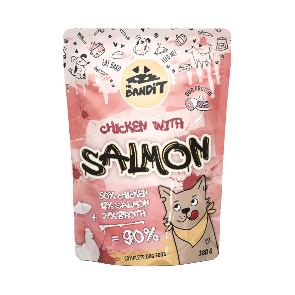 Sestava: piščanec 50 % (od tega piščančje meso 27 %, jetra 17 %, piščančja maščoba 3 %, piščančja koža 3 %), juha iz lososa 27 %, losos 13 %, krompirjev škrob 4 %, buča 2 %, korenje 2 %, riž 1,7 %, sušene brusnice 0,3 %. Analitska sestava: surove beljakovine 8,50 %, surove maščobe 3,0 %, surovi pepel 3,0 %, surove vlaknine 1,50 %, vlaga 82,0 %, kalcij 0,20 %, fosfor 0,15 %, FOS 3.00 g/kg. Prehranski dodatki/kg: vitamin D3 (3a671) 125 IE. Elementi v sledovih: cink (3b610) 17 mg, mangan (3b510) 5 mg, jod (c3b202) 0,15 mg, baker (3b405) 4 mg, železo 15 mg. Tehnološki dodatki: natrijev nitrit (1aE250) 0,15 % mg/kg.