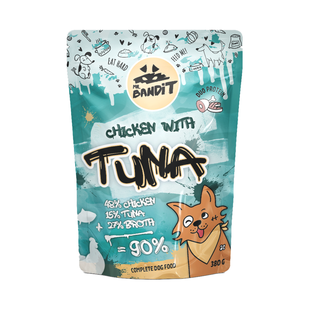 Sestava: piščanec 48 % (od tega piščančje meso 25 %, jetra 17 %, piščančja maščoba 3 %, piščančja koža 3 %), juha iz tune 27 %, tuna 15 %, krompirjev škrob 4 %, buča 2 %, korenje 2 %, riž 1,7 %, sušene brusnice 0,3 %. Analitska sestava: surove beljakovine 8,50 %, surove maščobe 3,0 %, surovi pepel 3,0 %, surove vlaknine 1,50 %, vlaga 82,0 %, kalcij 0,20 %, fosfor 0,15 %, FOS 3.00 g/kg. Prehranski dodatki/kg: vitamin D3 (3a671) 125 IE. Elementi v sledovih: cink (3b610) 17 mg, mangan (3b510) 5 mg, jod (c3b202) 0,15 mg, baker (3b405) 4 mg, železo 15 mg. Tehnološki dodatki: natrijev nitrit (1aE250) 0,15 % mg/kg.