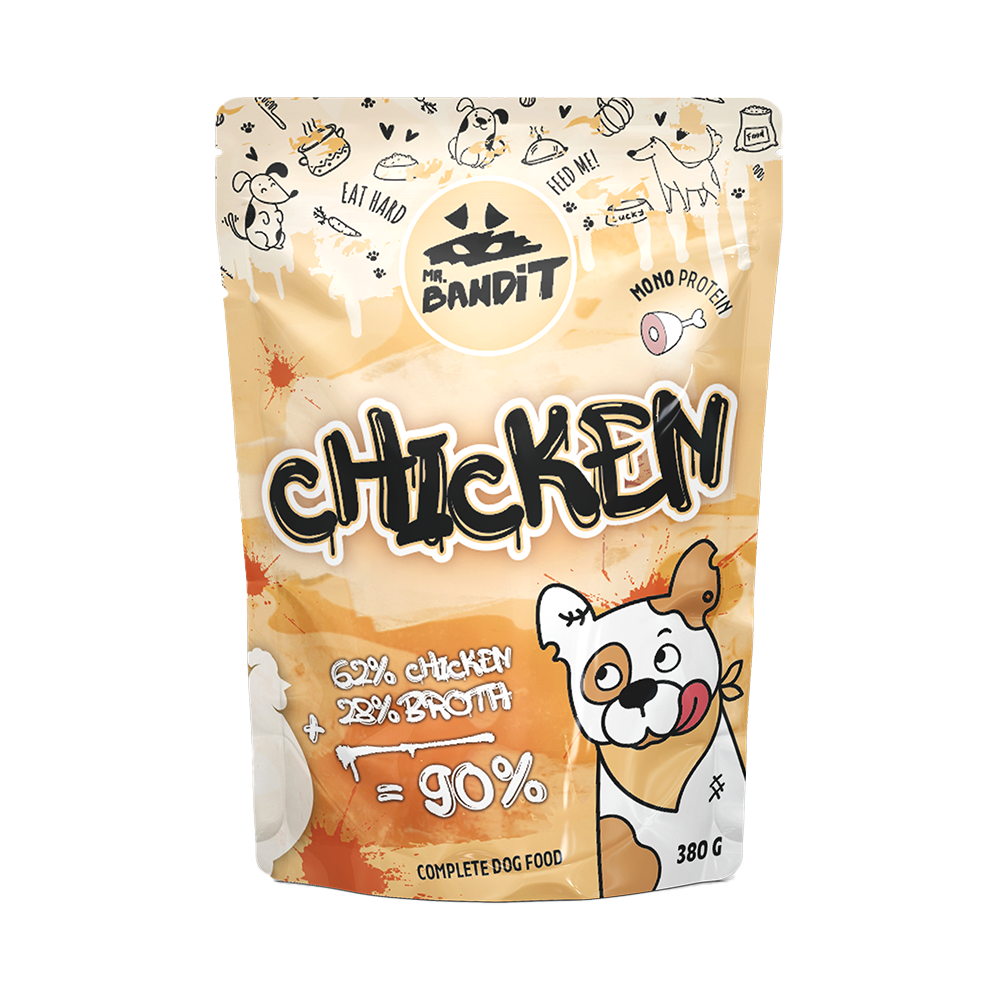 Sestava: piščanec 62 % (od tega piščančje meso 34 %, jetra 18 %, srce 4 %, piščančja maščoba 3 %, piščančja koža 3 %), juha iz piščanca 28 %, krompirjev škrob 4 %, buča 2 %, korenje 2 %, riž 1,7 %, sušene brusnice 0,3 %. Analitska sestava: surove beljakovine 8,50 %, surove maščobe 3,0 %, surovi pepel 3,0 %, surove vlaknine 1,50 %, vlaga 82,0 %, kalcij 0,20 %, fosfor 0,15 %, FOS 3.00 g/kg. Prehranski dodatki/kg: vitamin D3 (3a671) 125 IE. Elementi v sledovih: cink (3b610) 17 mg, mangan (3b510) 5 mg, jod (c3b202) 0,15 mg, baker (3b405) 4 mg, železo 15 mg. Tehnološki dodatki: natrijev nitrit (1aE250) 0,15 % mg/kg.