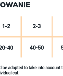 Dnevna priporočena količina hrane za mačke je navedena v tabeli. Prilagodite velikosti, starosti, temperamentu in aktivnosti mačke. Žival naj ima na voljo vedno pitno vodo. Hranite v suhem in hladnem prostoru.