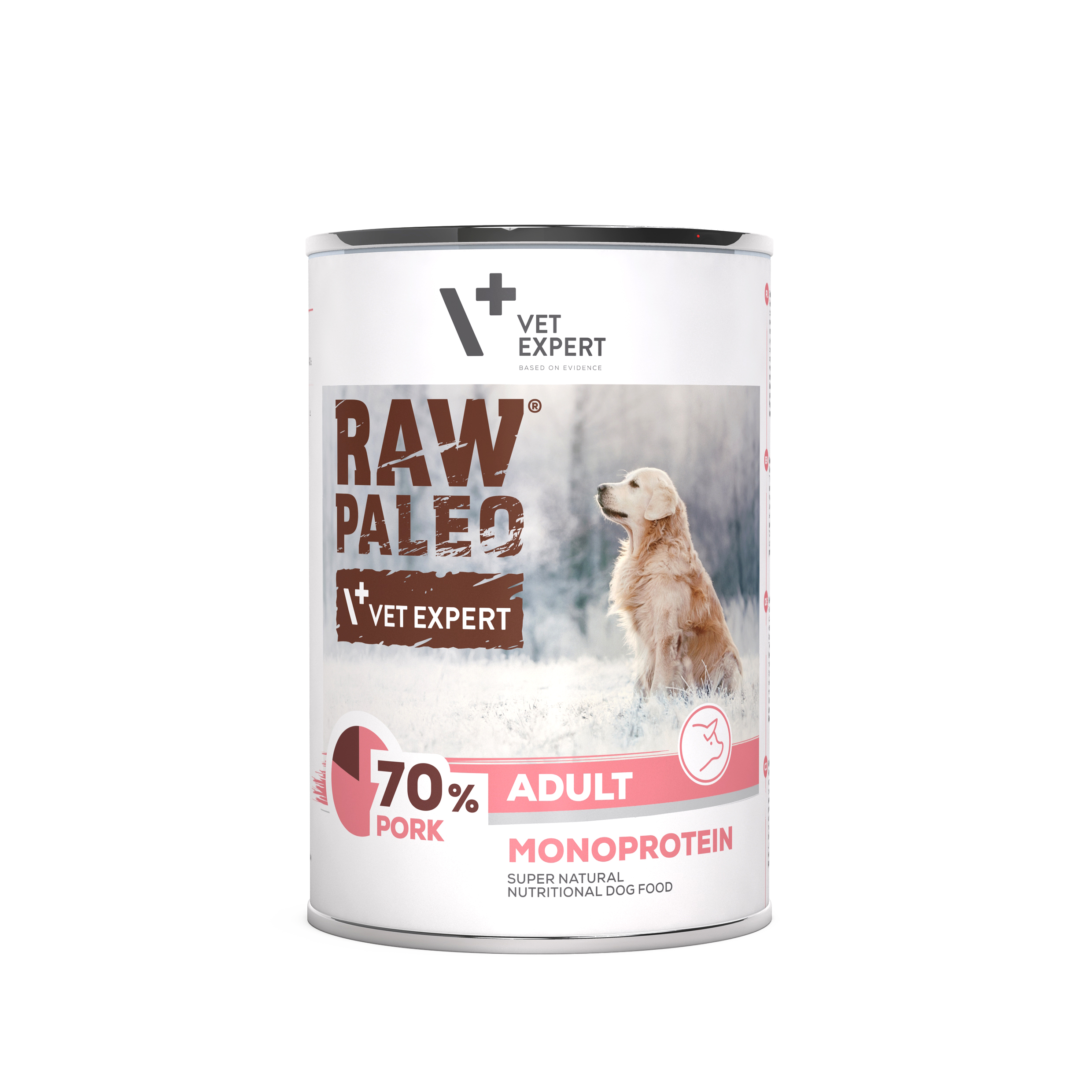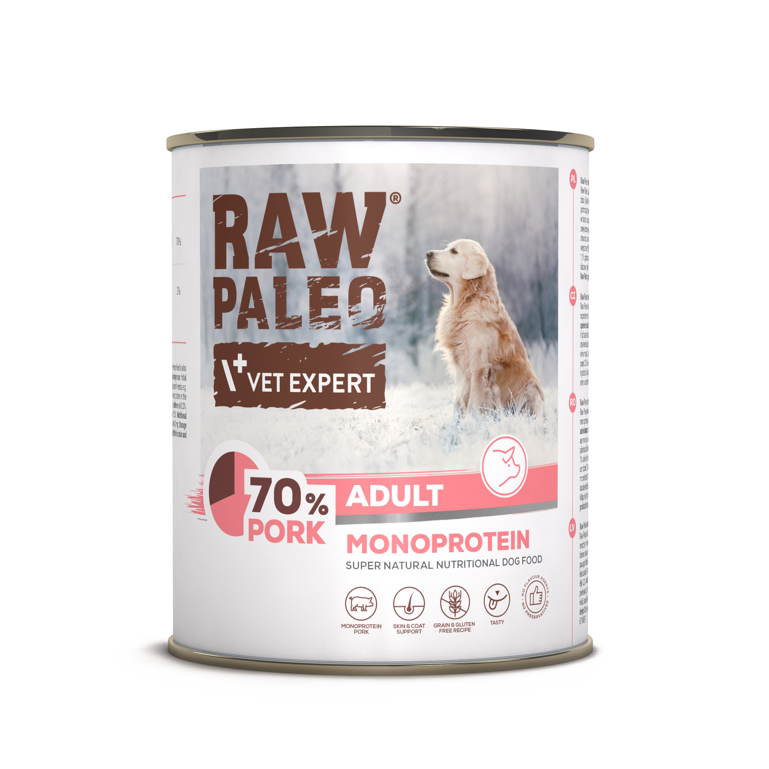 Raw Paleo Adult Dog Svinjina je popolna uravnotežena monoproteinska hrana za odrasle pse, starejše od 1. leta z okusom svinjine.