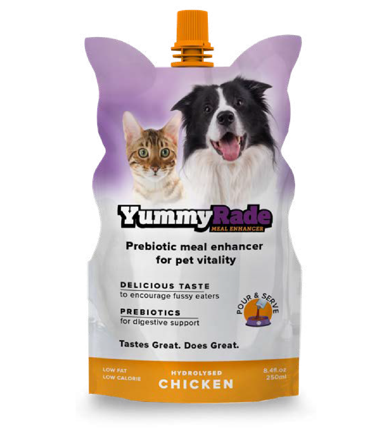 Psi in mačke so velikokrat hranjeni zgolj s suho hrano, dodatek YummyRade napitka jih spodbudi k jedi in nudi ustrezno količino tekočine k obroku.